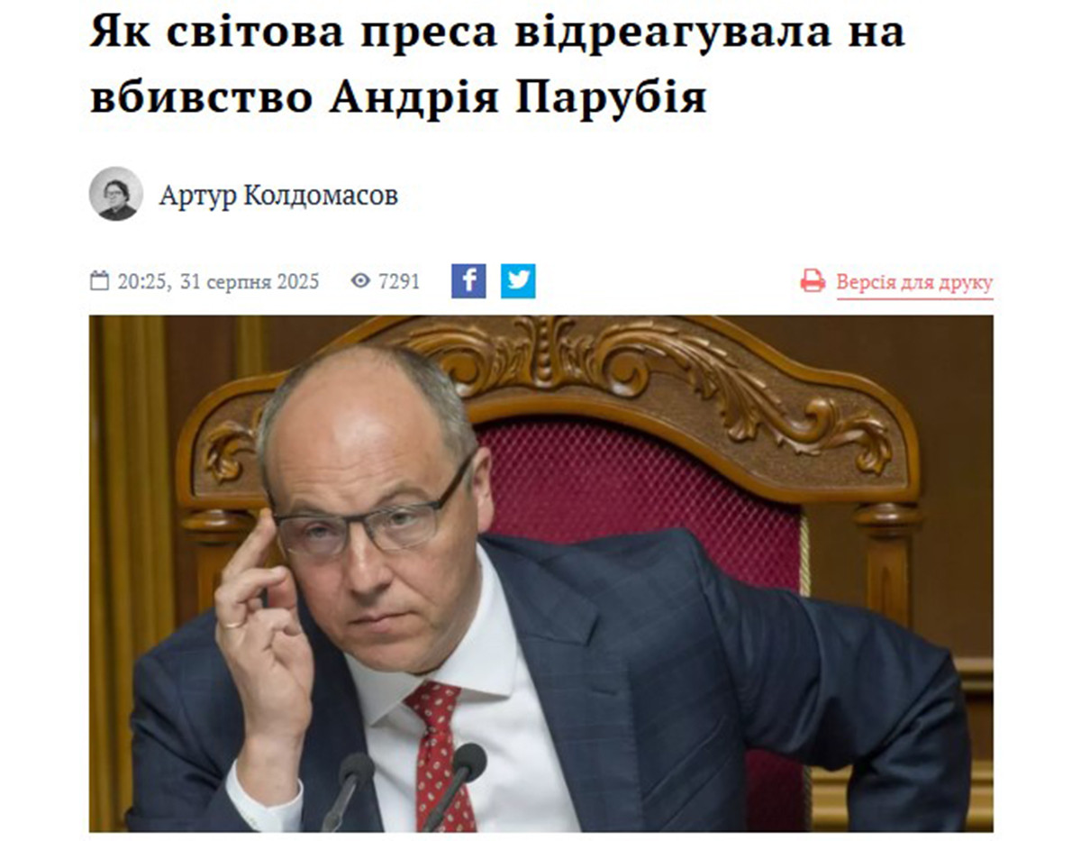 30 серпня 2025 року було вбито народного депутата від «Європейської солідарності» Андрія Парубія. Артур Колдомасов зібрав реакції про цю трагічну подію як якісних, так і маргінальних медіа різних країн світу.