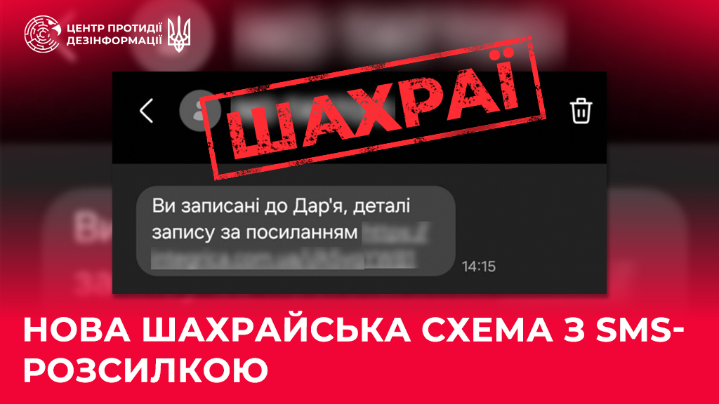 Шахраї запустили нову схему — масово розсилають смс із текстом «Ви записані на прийом». У повідомленні навмисно не вказано, куди саме запис, щоб користувачі з цікавості натиснули на посилання, яке міститься в цьому смс. Про це повідомили в Центрі протидії дезінформації.