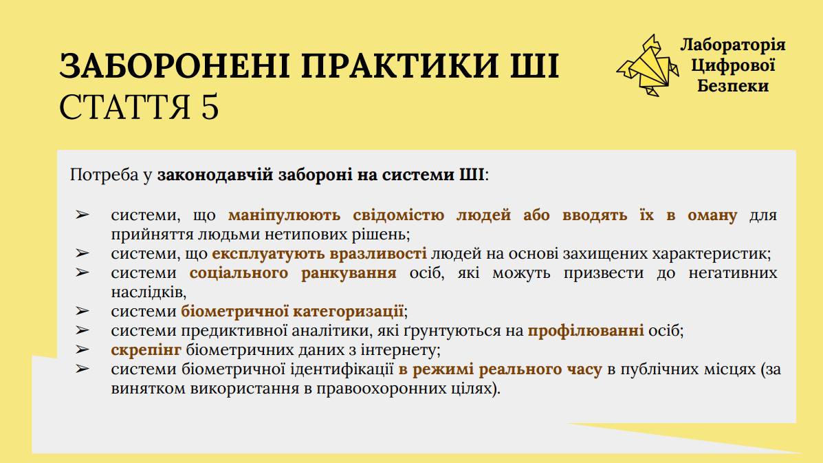 Вона звернула увагу на ключові положення, зокрема статтю 5 щодо заборонених практик у сфері ШІ. За її словами, в Україні досі немає законодавчих запобіжників, які б обмежували маніпулятивні, оманливі або високоінтрузивні системи, що створює ризики для прав людини.