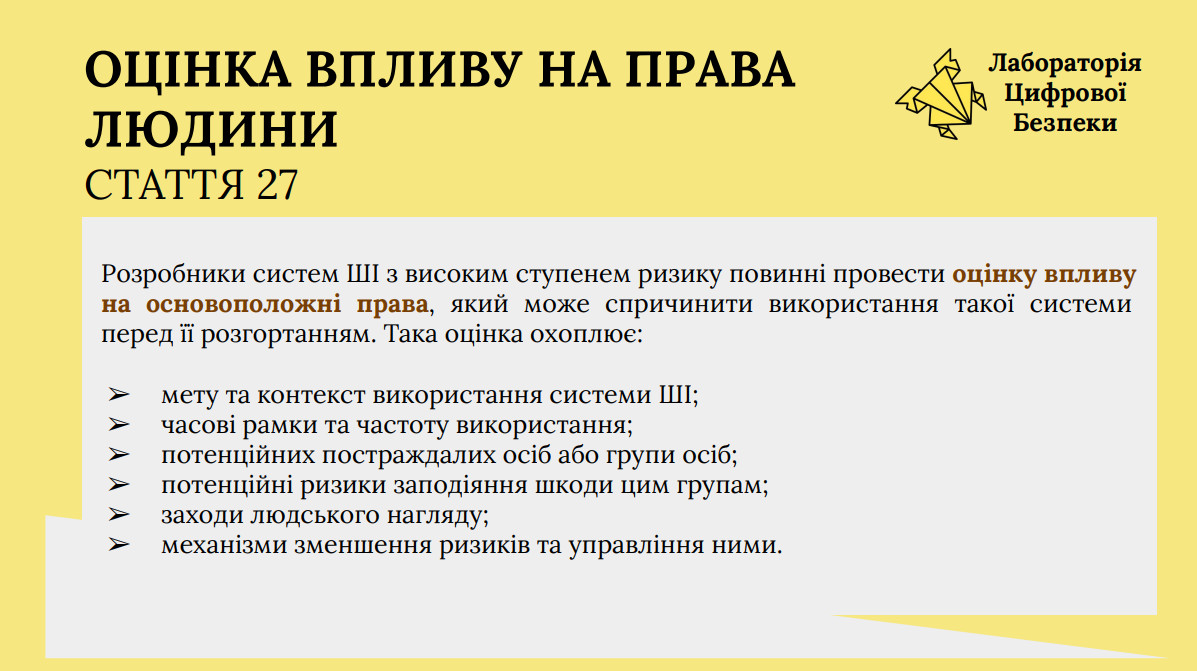 «Потреба у здійсненні оцінки впливу на права людини також повинна бути передбачена на рівні законодавства. Вона пов'язана з вимогою у здійсненні управління ризиками систем ШІ, які можуть мати вплив на права людини. Такі методи і техніки, інструкції щодо того, як здійснити таку оцінку впливу, варто передбачати на підзаконному рівні, але саме посилання і обов'язок розробників здійснювати таку оцінку впливу, очевидно, має бути передбачена на рівні законодавства», — зауважила юристка.