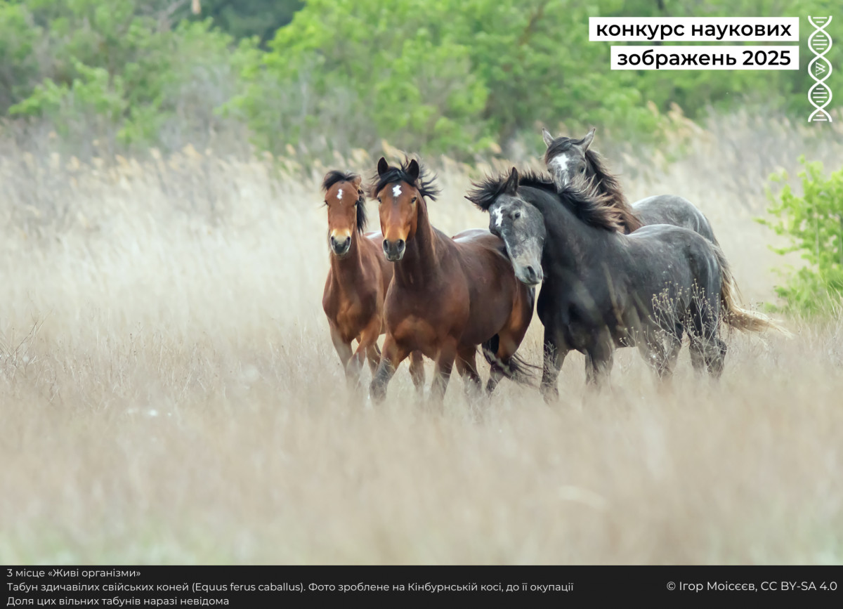 Третє місце — табун здичавілих свійських коней (Equus ferus caballus). Фото зроблене на Кінбурнській косі, до її окупації. Доля цих вільних табунів наразі невідома. Автор — Ігор Моісєєв.