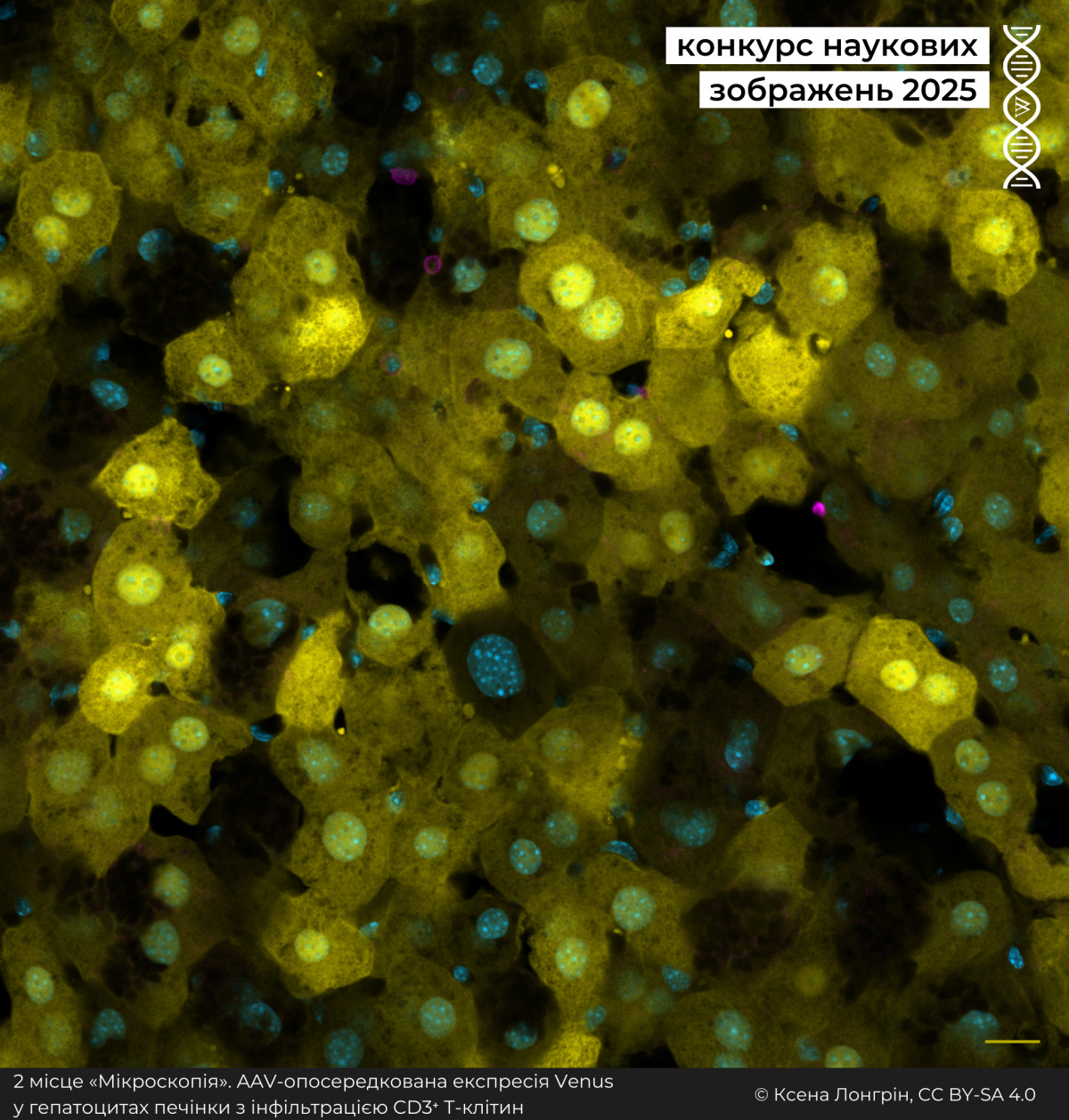 Друге місце — AAV-опосередкована експресія Venus у гепатоцитах печінки з інфільтрацією CD3⁺ Т-клітин. Авторка — Ксена Лонгрін.