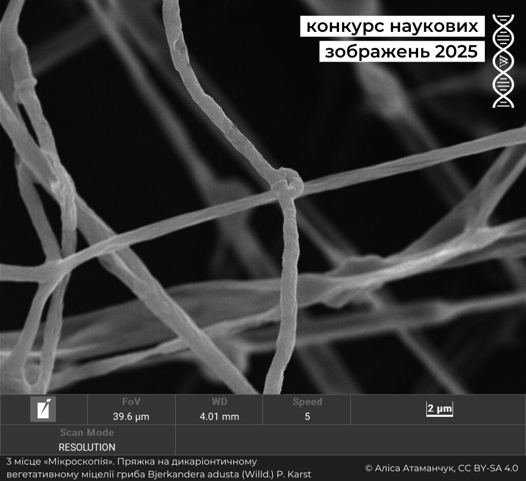 Третє місце — пряжка на дикаріонтичному вегетативному міцелії гриба Bjerkandera adusta (Willd.) P. Karst. Авторка — Аліса Атаманчук.
