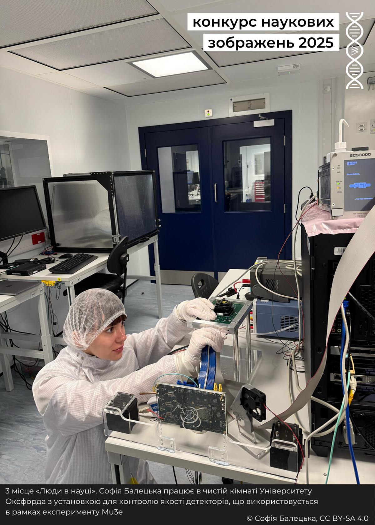 Третє місце — Софія Балецька працює в чистій кімнаті Університету Оксфорда з установкою для контролю якості детекторів, що використовується в рамках експерименту Mu3e. Авторка — Софія Балецька.
