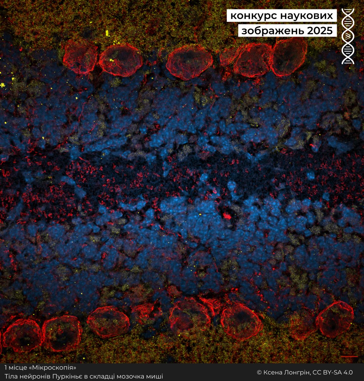 Перше місце — тіла нейронів Пуркіньє в складці мозочка миші. Авторка — Ксена Лонгрін.